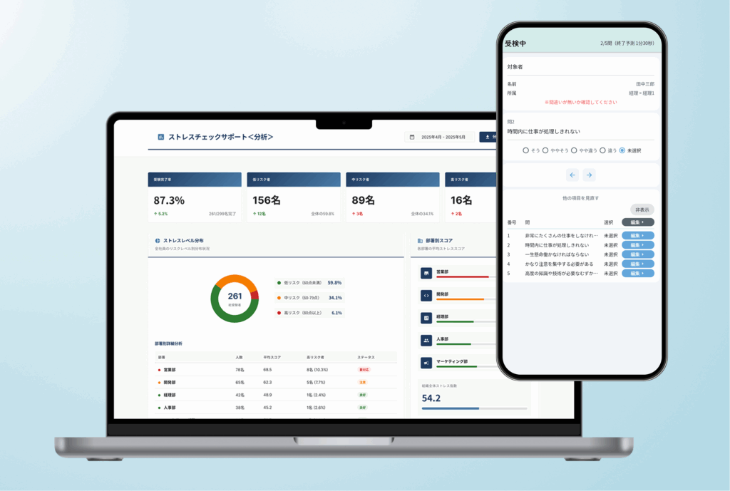 スマホやPCから数分で回答でき、結果はリスク度別に自動集計。部署ごとの傾向を可視化し、産業医面談や職場改善施策につなげます。